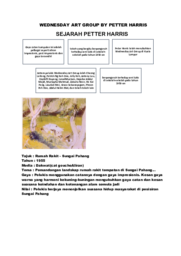 Kesan gaya warna yang harmoni kekuning-kuningan mengukuhkan gaya catan dan kesan. Dikripsi karya ini bertajuk Rumah Rakit Sungai Pahang yang telah dihasilkan oleh Peter Harris seorang ahli Wenesday Art Group yang popular dengan mengunakan Gouche bagi mengantikan putih telur pada masa itu. Rumah Rakit - Sungai Pahang - Peter Harris.